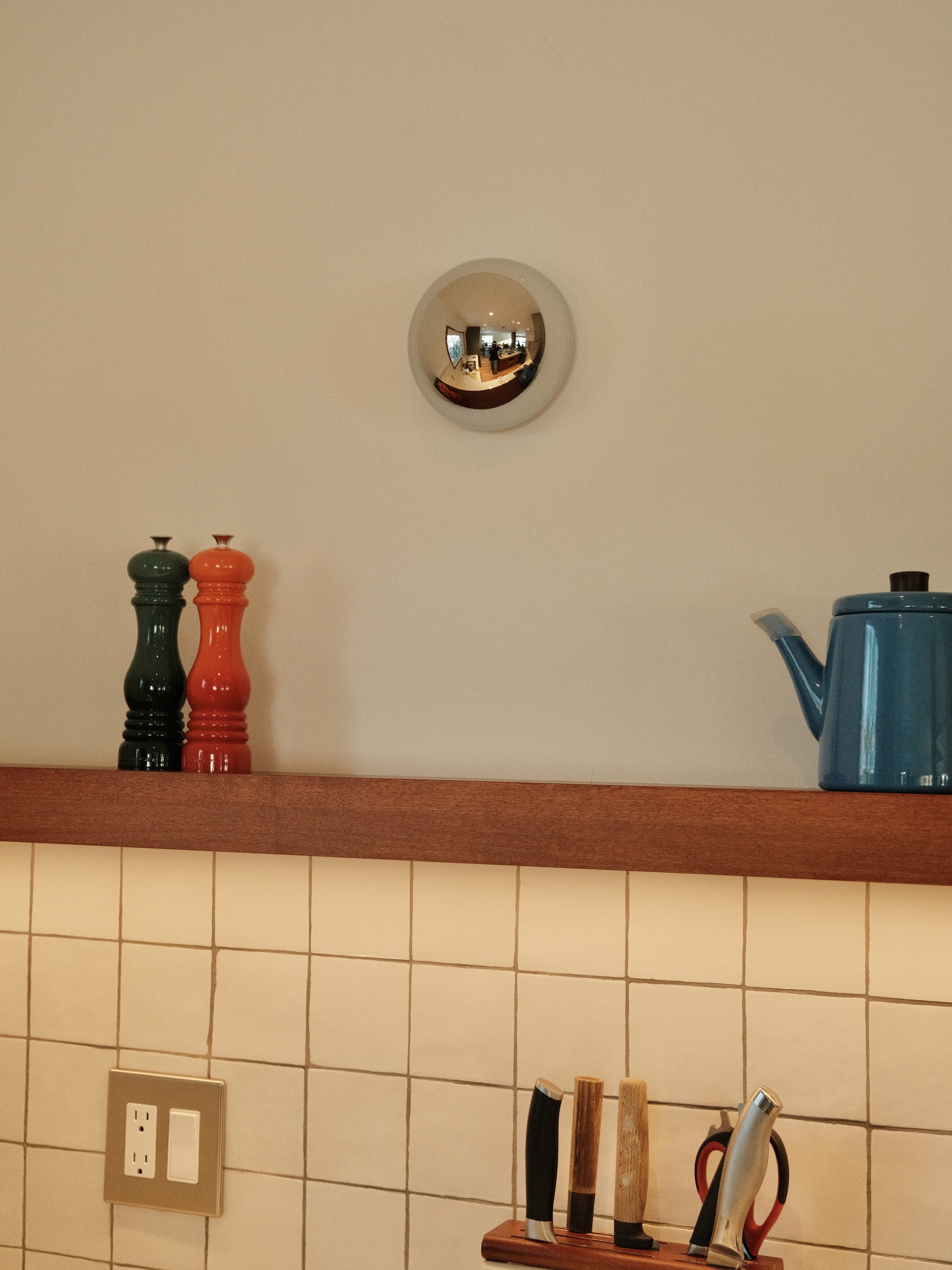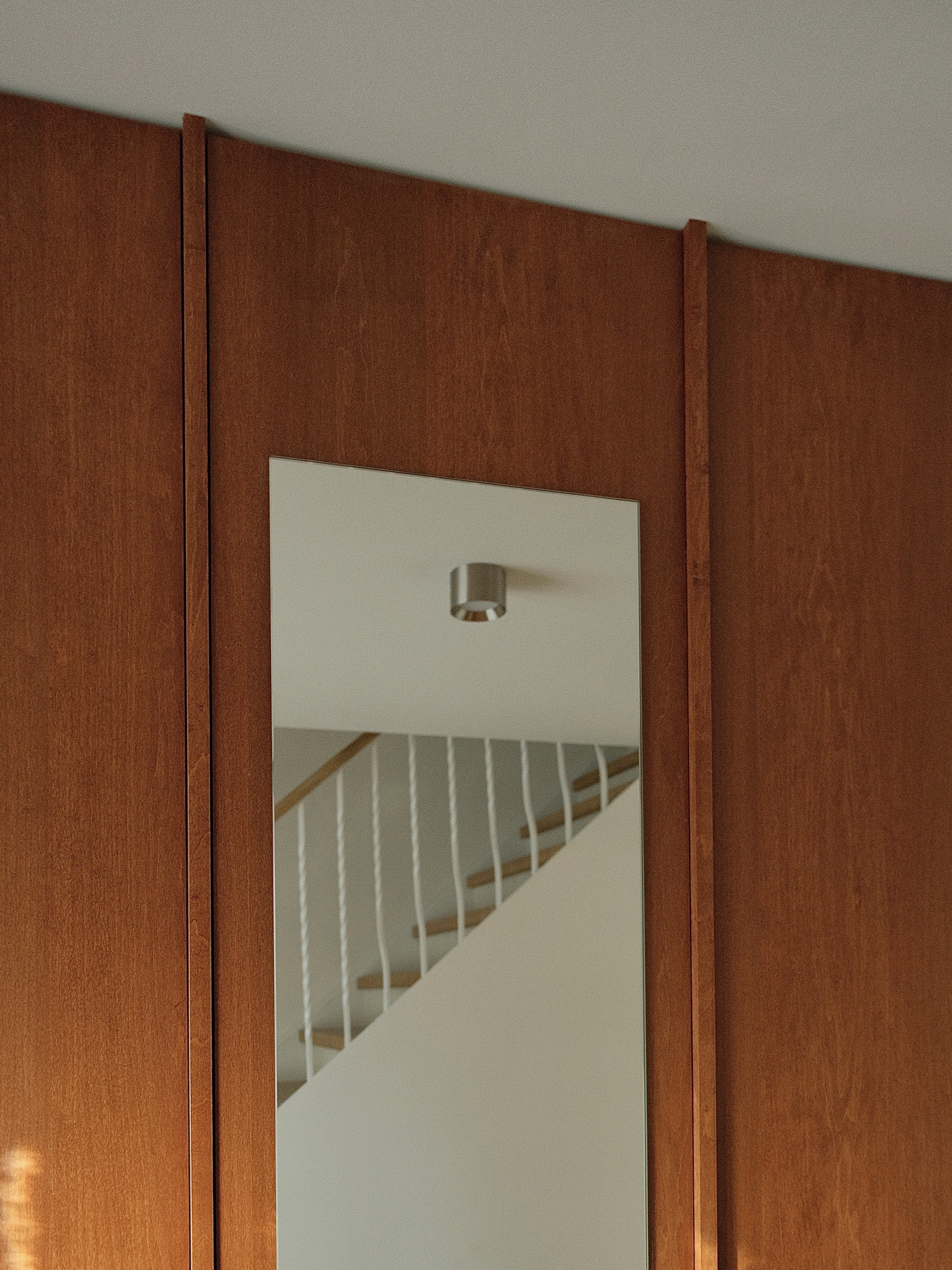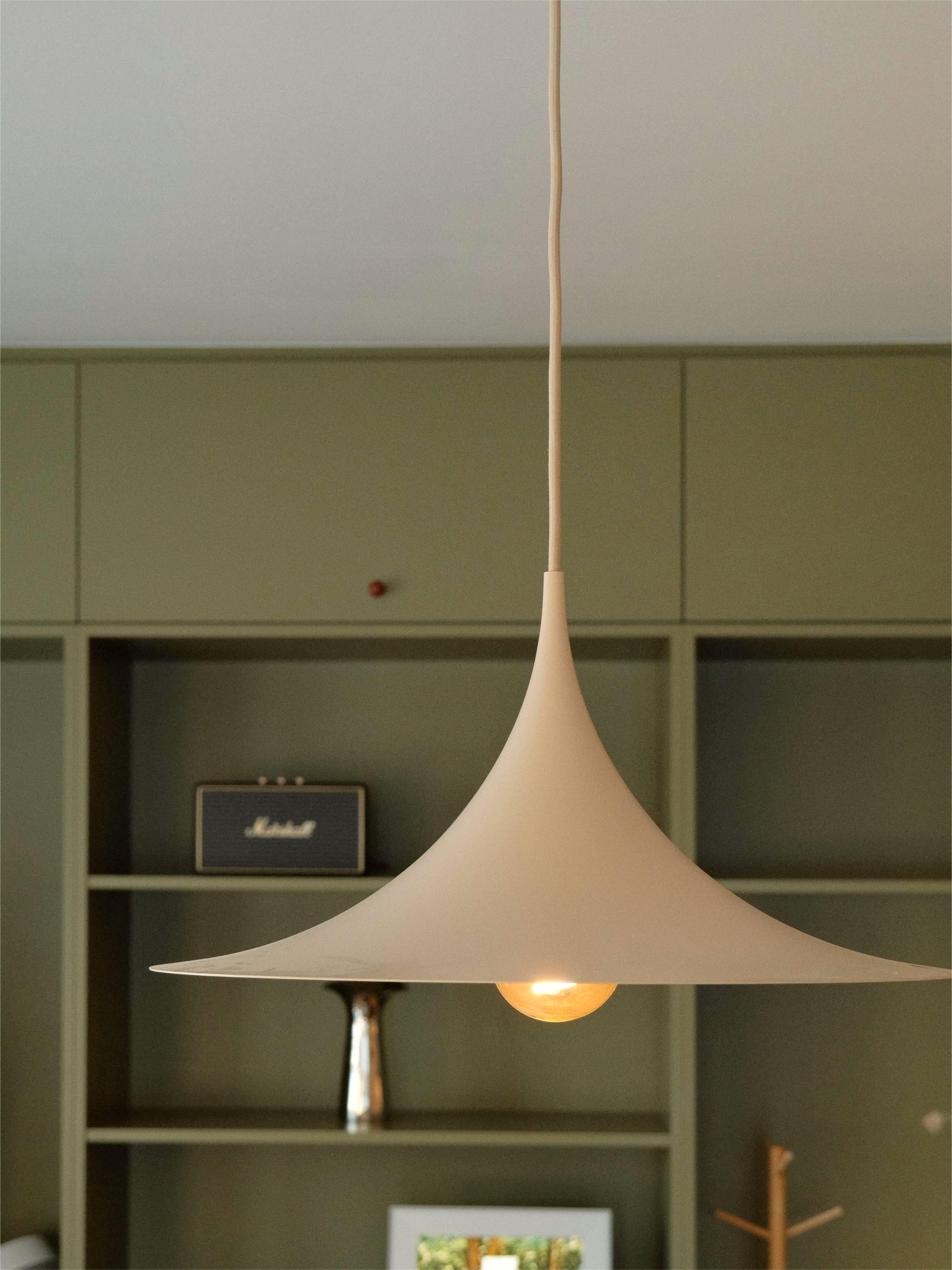 Anchored by a full-height olive green cabinetry wall and balanced with teak-toned kitchen elements, the palette draws from mid-century warmth and Bauhaus precision.